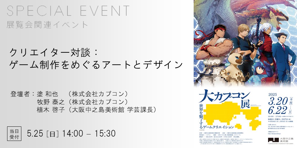 | 登壇者 | 塗 和也 (株式会社カプコン アートディレクター/キャラクターデザイナー) 牧野 泰之(株式会社カプコン プロデューサー) 植木 啓子(大阪中之島美術館 学芸課長) |