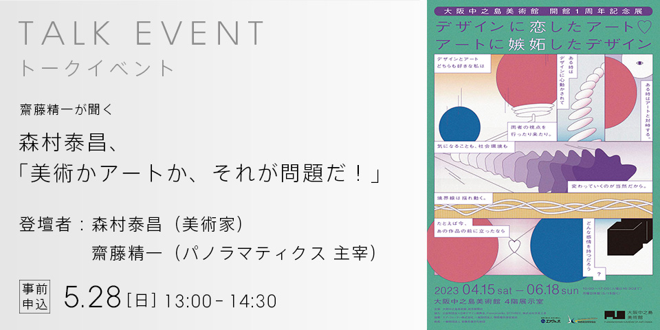 | 申込方法 | *追加で先着60席分を募集いたします。当日12:30より1階ホール前にて受付いたします。 *当日受付の方も「デザインに恋したアート♡アートに嫉妬したデザイン」の観覧券(利用後の半券可)が必要です。当日、ご提示ください。 |