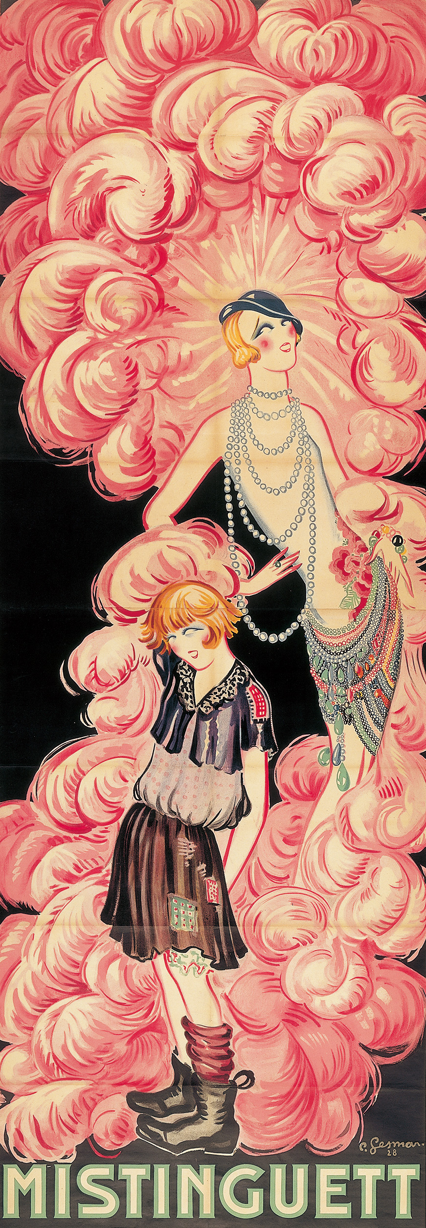 アール・デコの時代、モンマルトルのカフェ・コンセール、ムーラン・ルージュの人気女優はミスタンゲットでした。長いまつげと大きな目が特徴で、瞳を上下に動かしながらダンスを踊り高らかに歌う彼女は、この時代のスーパースターでした。ここでは、ミスタンゲットをモデルにした大型グラフィック作品を展示し、大人気女優の姿を紹介します。また、同時代の他の人気女優の姿も合わせて紹介します。