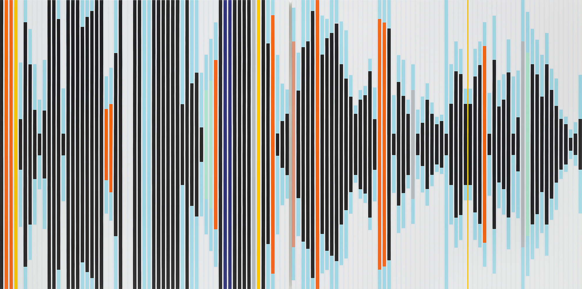 「サウンドグラフ」は、モリスの絵画と映像作品の交差地点に位置づけられる絵画シリーズです。この絵画シリーズは、映像作品《有限のゲームと無限のゲーム》の撮影時にモリスが録音した音声をもとにしています。硬質な輪郭を持つ幾何学的形状がカンヴァス上で不規則に進行と退行を繰り返す構図は、膨張と収縮を繰り返しているようでもあり、コーディングを視覚化しているようにも見えます。