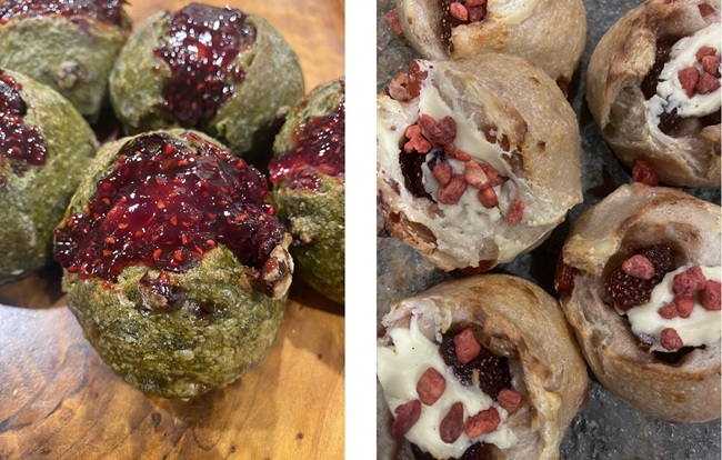 抹茶と薔薇のアロマを練り込んだ生地にクランベリーを合わせ、サワークリームを包み焼き上げた後、上に自家製フランボワーズジャムをのせました。パン・シュル・ドゥ