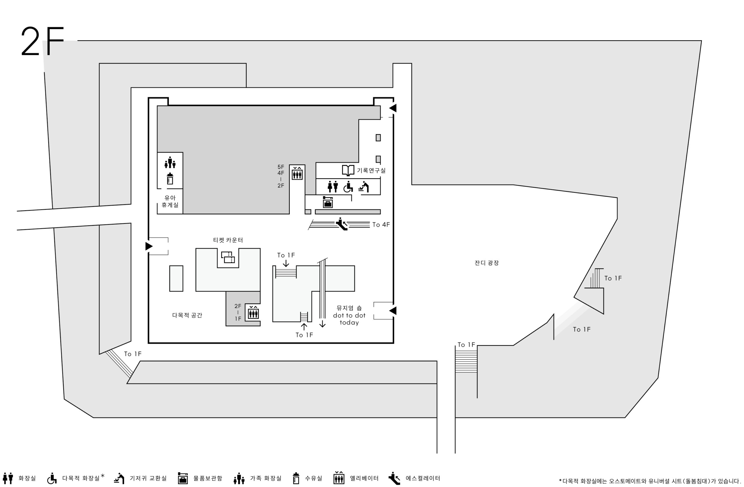 | 2F | 티켓 카운터·부모와 아이 휴게실·아카이브즈 정보실·잔디광장(옥외) |