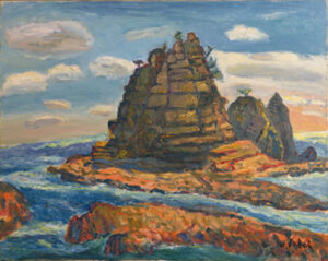 刻々と変化してゆく陽光と、それがてらしている海面、なにかしら動物の甲羅のように見えるごつごつとした岩山。まさに鍋井の現場での写生重視がみてとれる。